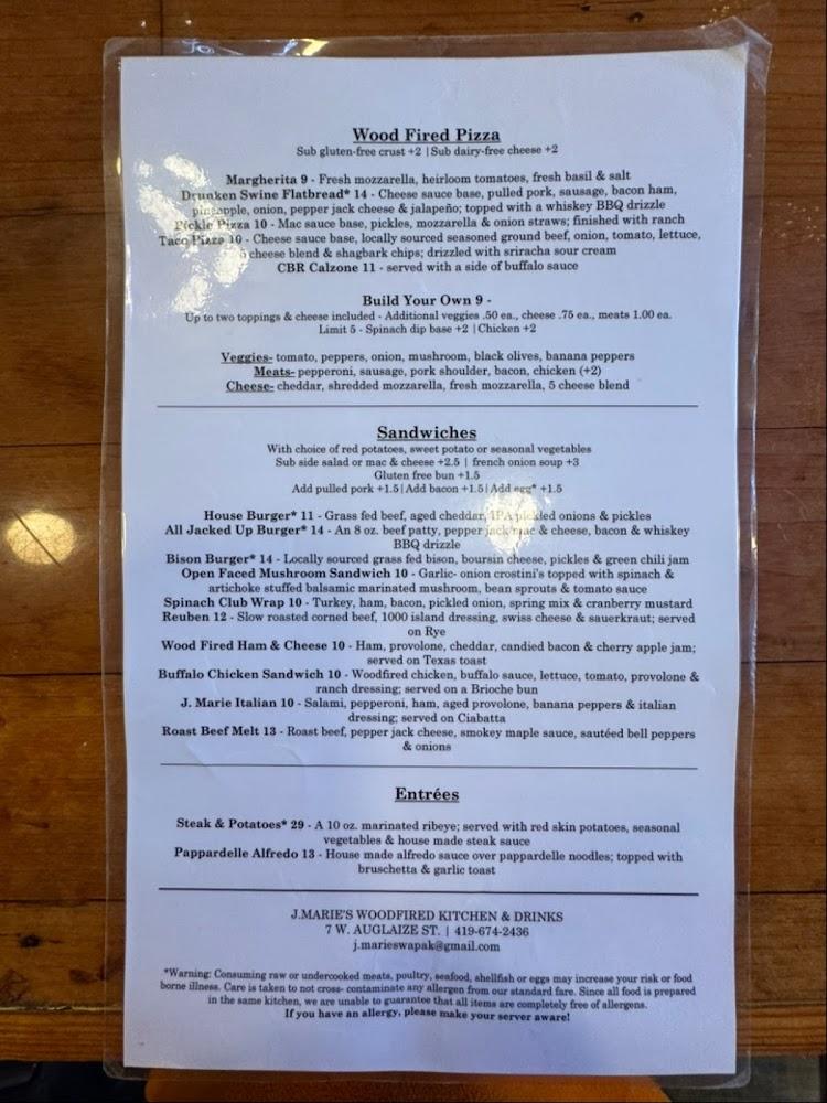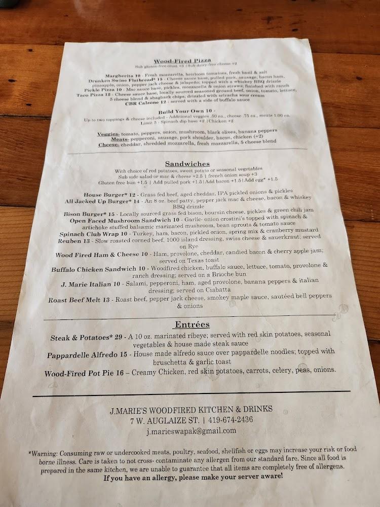 Welcome to J. Marie's Wood-Fired Kitchen and Drinks, where modern American cuisine meets a cozy, inviting atmosphere. Located in Wapakoneta, OH, our restaurant features a charming terrace for outdoor dining, along with a diverse menu that includes delicious wood-fired specialties, excellent cocktails, and a wide selection of local beers and wines. Whether you're here for a quick lunch, a hearty dinner, or to enjoy our famous desserts, J. Marie's offers prompt service and vegetarian-friendly options. With accessible seating and facilities, everyone can enjoy a memorable dining experience. Join us for happy hour specials and dine late into the evening!