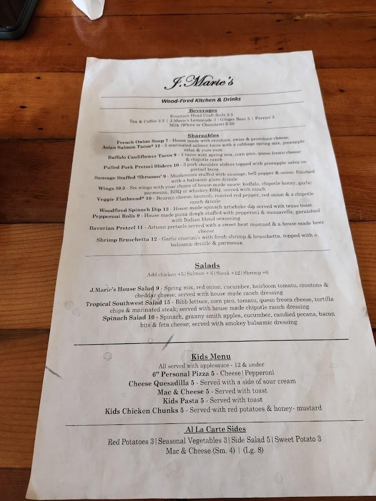 Menu favorites include the spinach dip, bison burger, and house salads that brighten any meal. Desserts like cheesecake cap off experiences with sweet notes. Craft sodas and local brews enhance drink options, reflecting the community’s vibrant culinary scene. Dining at J. Marie's provides variety and plenty of choices for everyone.